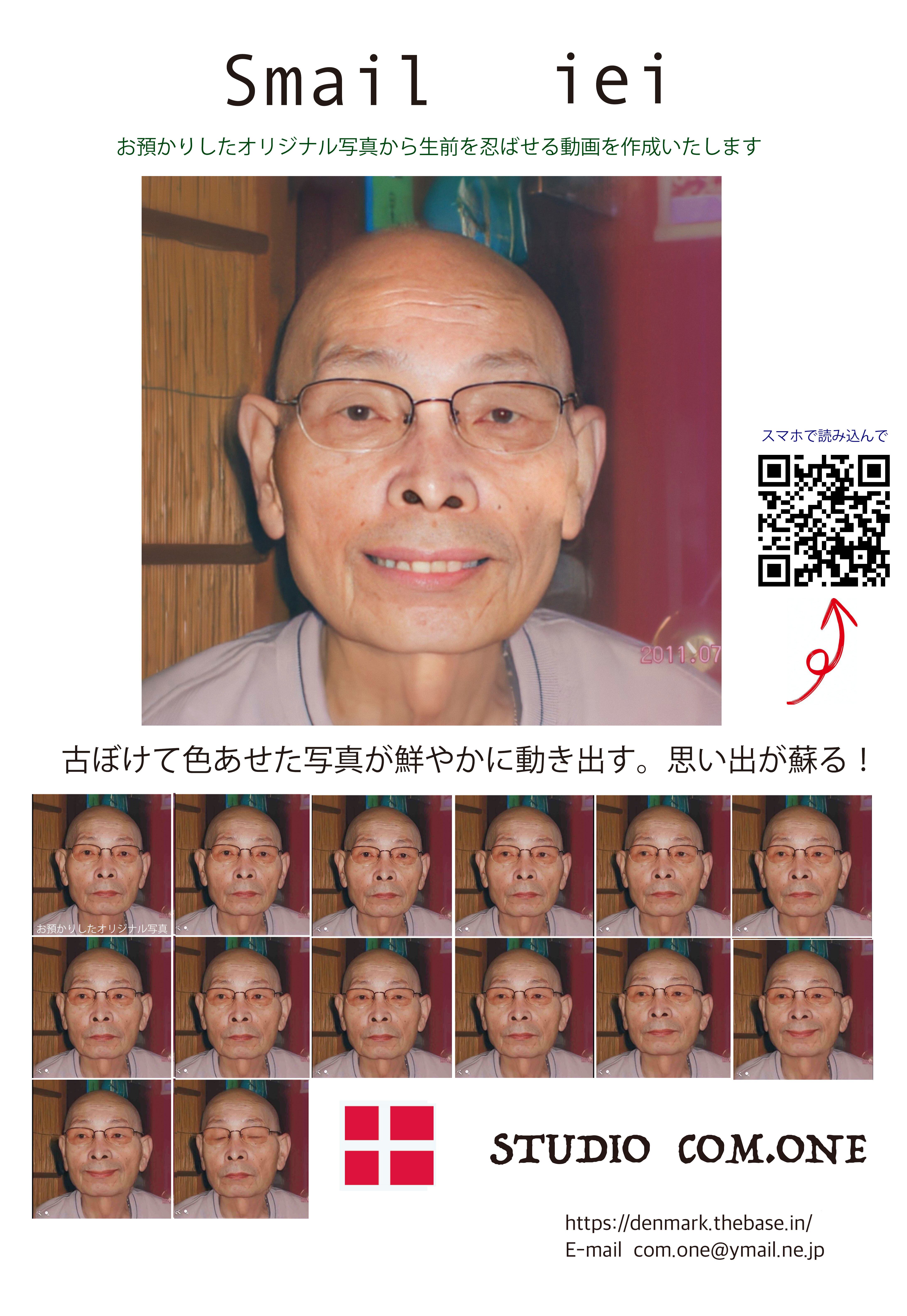 1枚の古い色褪せた写真からいろんなアングルの写真と動きのある遺影を 作成します。動画はRQコードをスマホで読み込むことで観れます (HP 最初の左側のサンプルE参照)